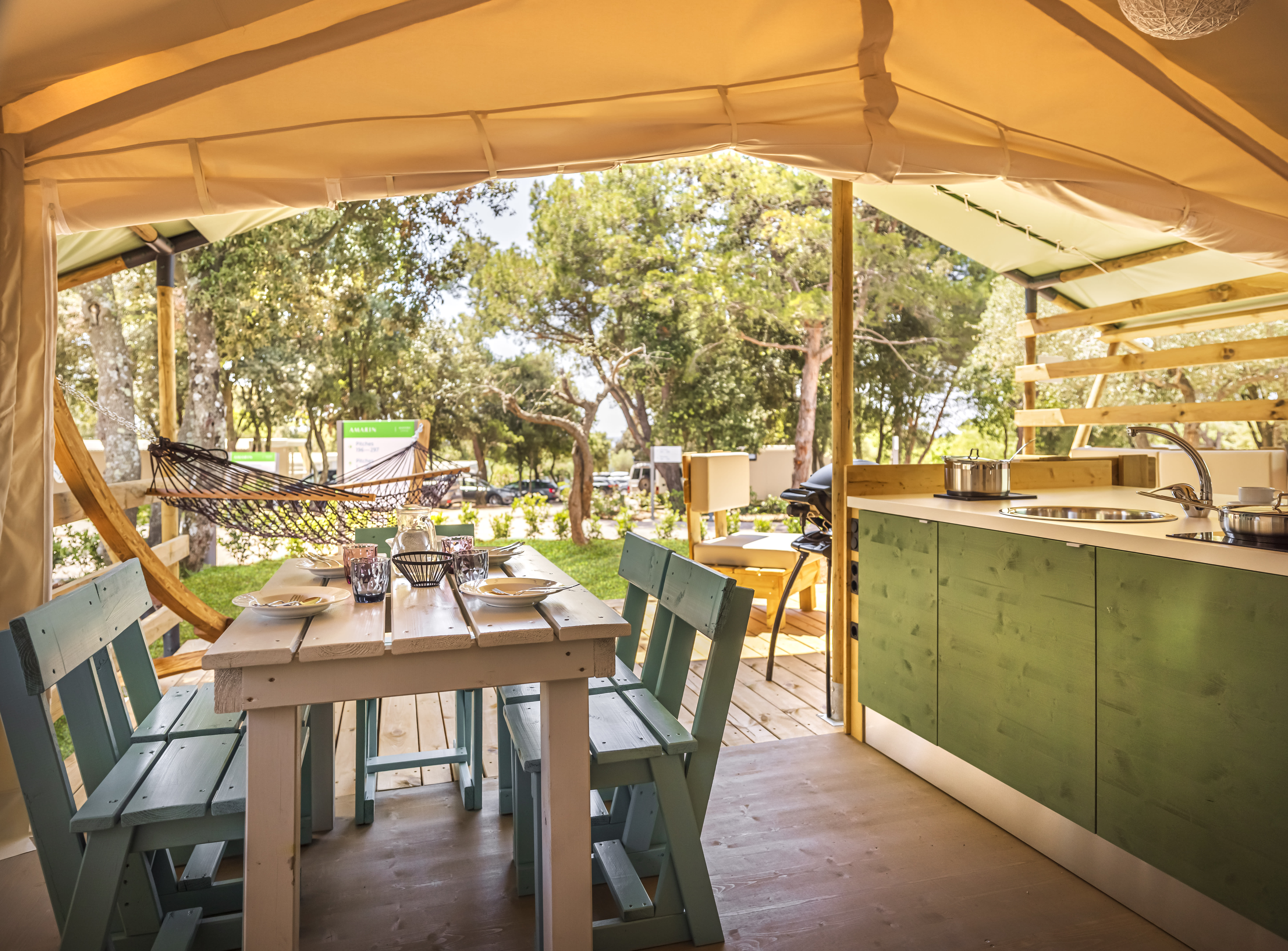 Diese modern eingerichteten Mobilheime sind komplett ausgestattet mit 3 Schlafzimmern, 2 Badezimmern, Küche und überdachter Terrasse – Sitzgarnitur und Hängematte inklusive. Ein Multigame-Tisch steht Ihnen ebenfalls zur Verfügung. Ganz in der Nähe befindet sich der Strand mit Blick auf Rovinj.