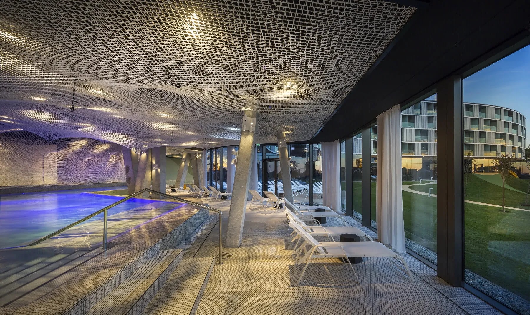 The modern and well-equipped pool zone inspired by the underground world of Istria and its numerous caverns and caves consists of three large indoor heated freshwater pools: