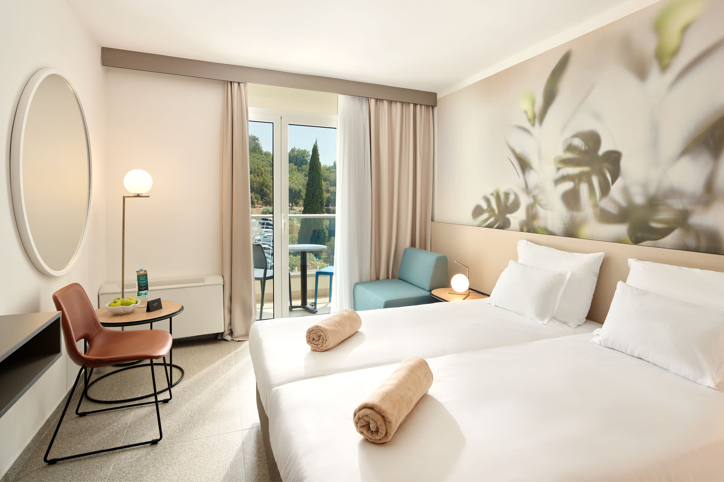 Udobna, sodobno urejena soba s pomožnim ležiščem se ponaša tudi z lastnim balkonom z razgledom na sredozemsko rastlinje.
