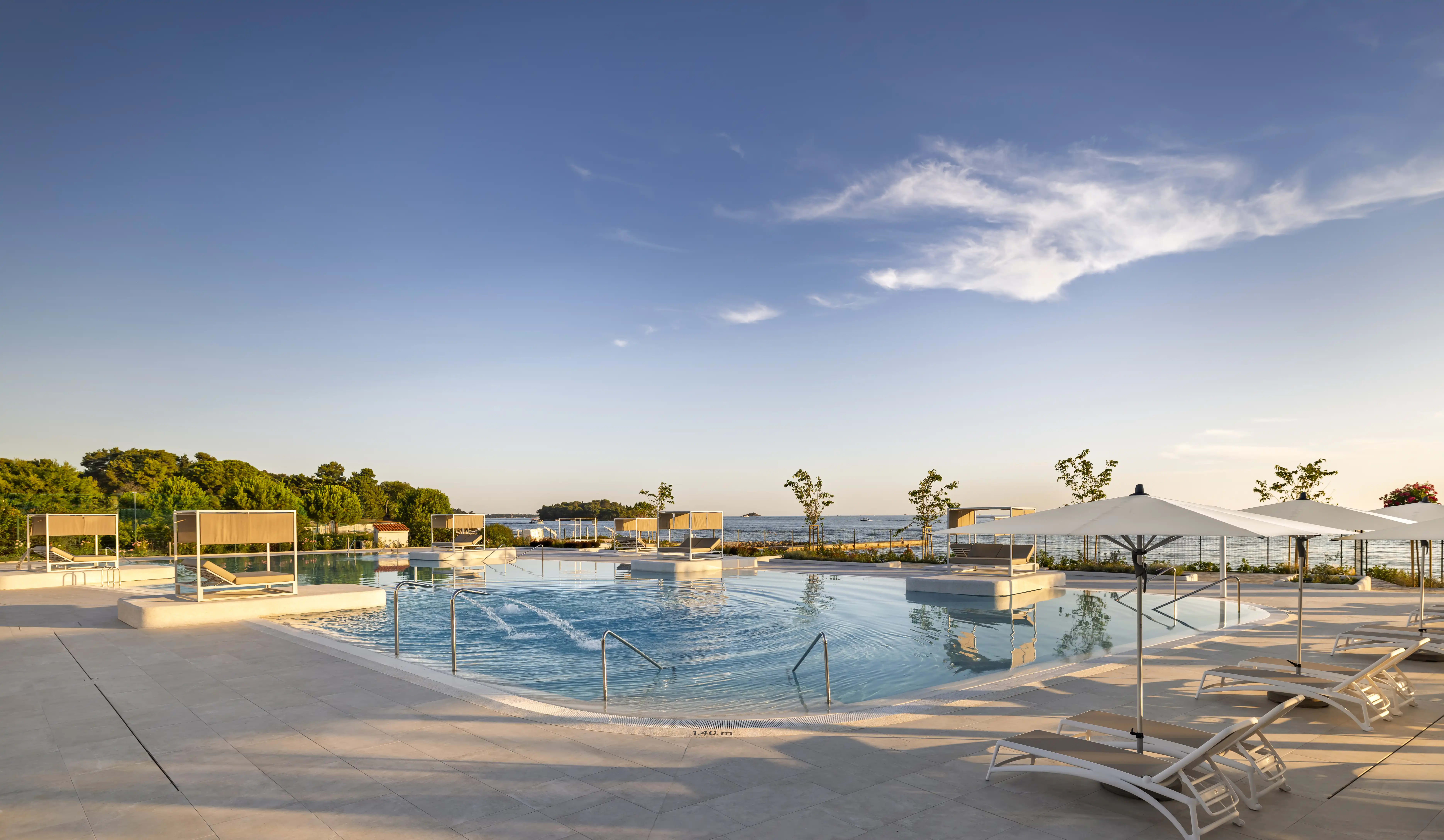Raznolike plaže vas čakajo – od kamnitih do peščenih in vse do tlakovanih, glavno plažo pa odlikuje modra zastava. Novi bazenski kompleks je pravo mesto za zabavo in sprostitev: tukaj se nahaja veliki bazen za plavanje in uživanje, otroški bazen za majhne pustolovce ter bazen s skakalnico za tiste, ki iščejo več vznemirjenja. Gostom so na voljo senčniki in ležalniki, vse od standardnih do velikih možnosti family lounge.